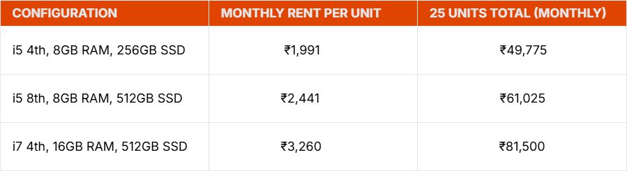 Yearly Rental Estimate for i5 laptops: ₹40,000 x 12 = ₹4,80,000 which is less than half of what you’d pay to purchase.